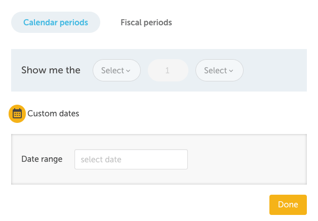 To get more specific, select custom fiscal periods. Here, you can choose the fiscal calendar you’d like to use, the period type (weeks, months, or quarters), and the range, so there’s no need to manually select the relevant dates.